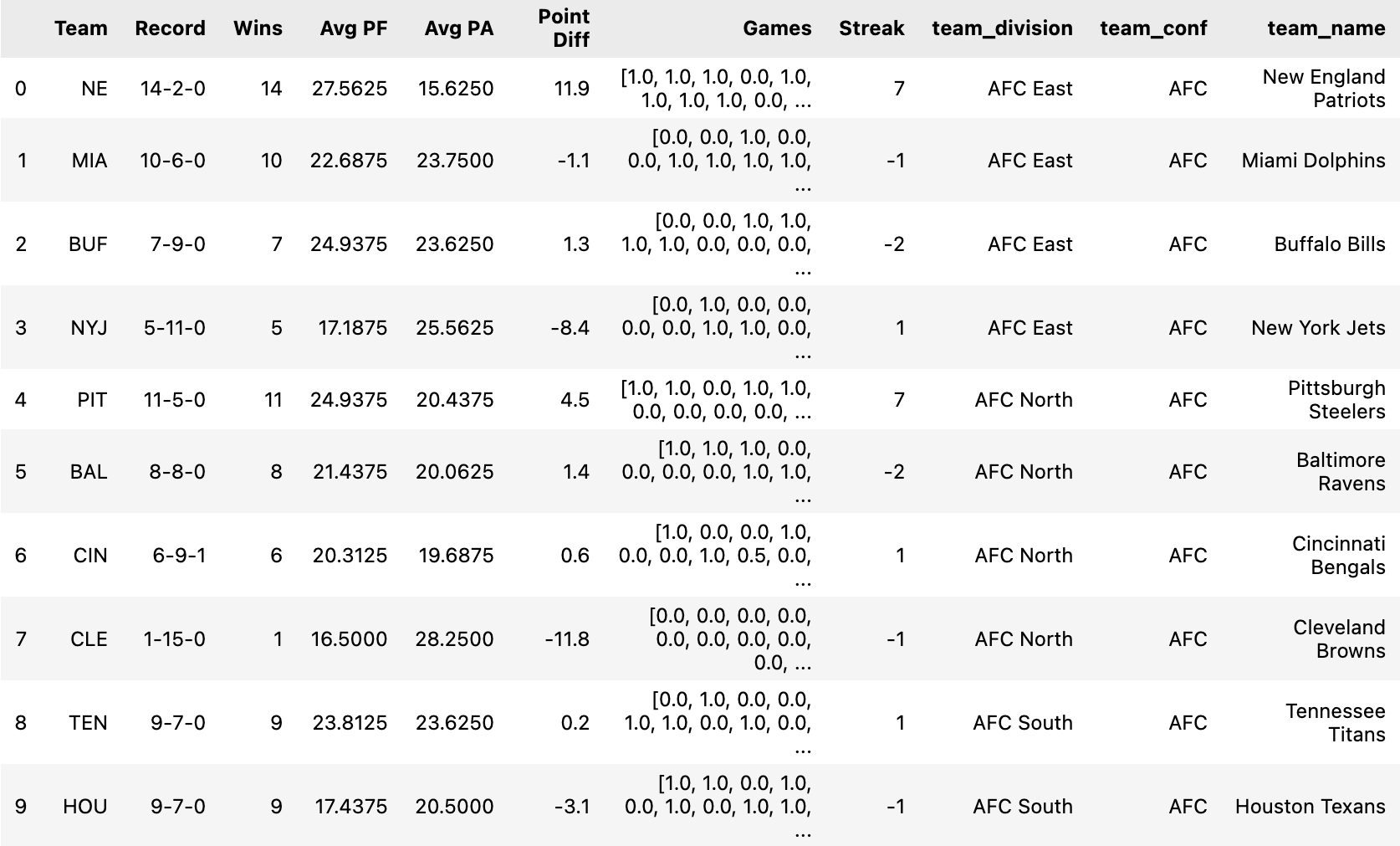 | Points For vs Points Against | Point Diff | Games | Streak | ||